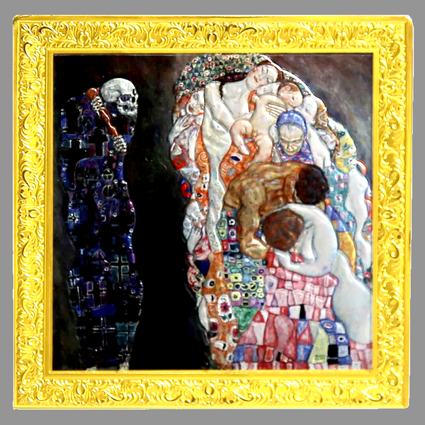 Wonderful Coin: "Death and Life" by Gustav Klimt (1862-1918) captures the moments of joy, beauty, youth, serenity, hope and acceptance of mortality. The artist called this painting his most important figurative work. Opening piece in the Masterpiece series, "Death and Life" is recreated on a half kilogram silver coin bar surrounded by an intricately designed frame. The exquisite details of the masterpiece are complemented by vibrant colors and high relief embossing. The Death and Life coin bar contains 500g of pure 999.9/1000 silver, has a face value of 40 Niue dollars and can be used as legal tender. Individually packed in an individually designed gift box that serves as a display case. It is truly a remarkable piece that will add to any collection.