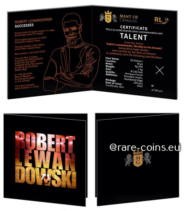 The captain of the Polnish national team and Bayern Munich striker is a very popular and gifted football talent. In his honor we present the 1 Kilo Robert Lewandowski silver coin in impressive high relief with a beautiful antique finish.