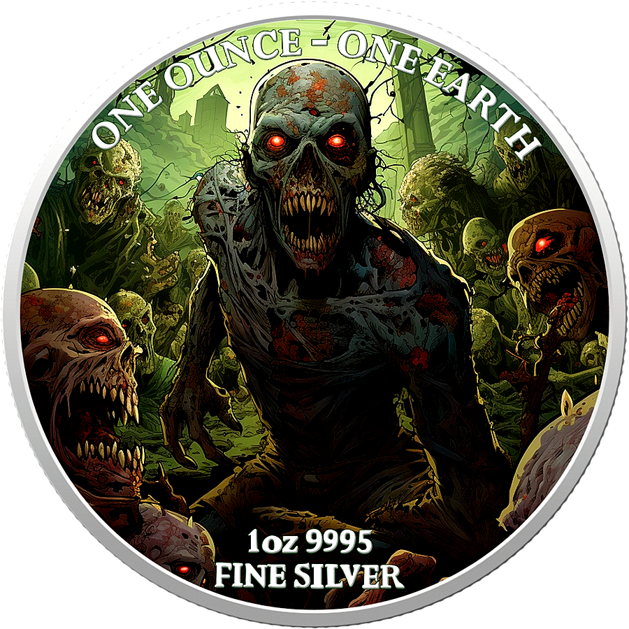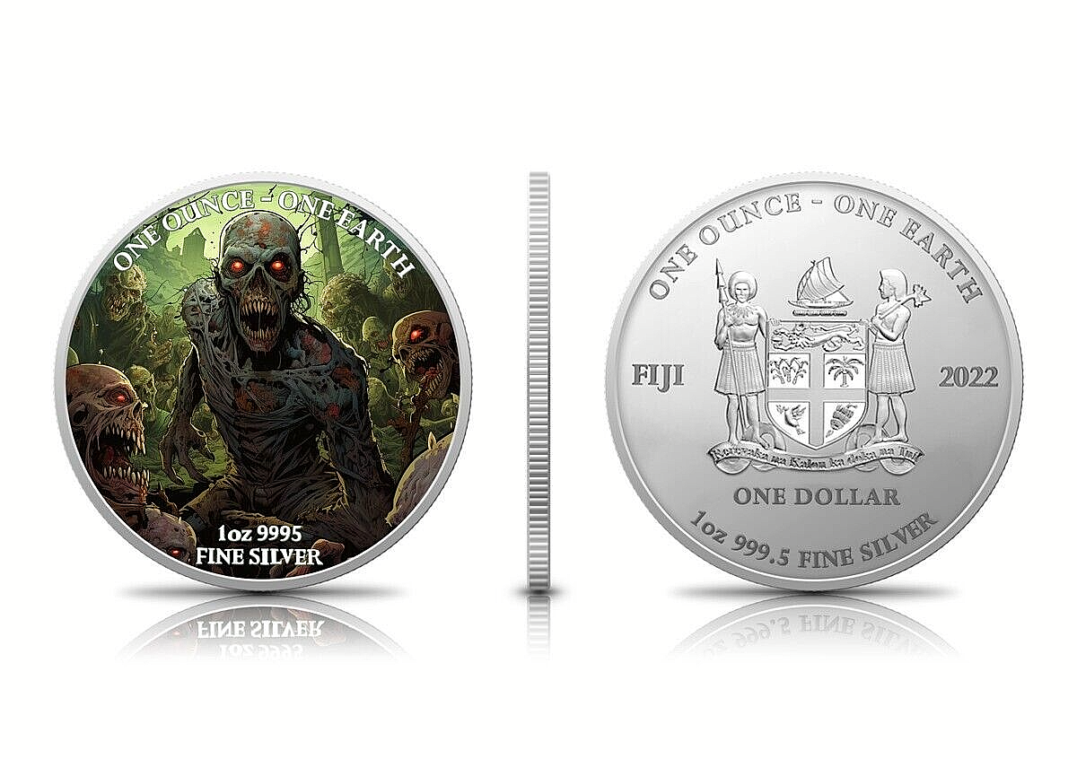 „Wir stellen Ihnen eine gruselige 1-Oz-Silbermünze vor, die eine Hommage an Zombies ist! Mit einem fesselnden und lebendigen Design, das im Dunkeln leuchtet, ist diese Münze wirklich ein unvergesslicher Anblick. Jede Münze ist sicher in ihrer Kapsel verpackt und wird von einem Zertifikat begleitet Authentizität: Da es weltweit nur 300 Exemplare gibt, sollten Sie sich die Chance nicht entgehen lassen, dieses exklusive Sammlerstück zu besitzen.