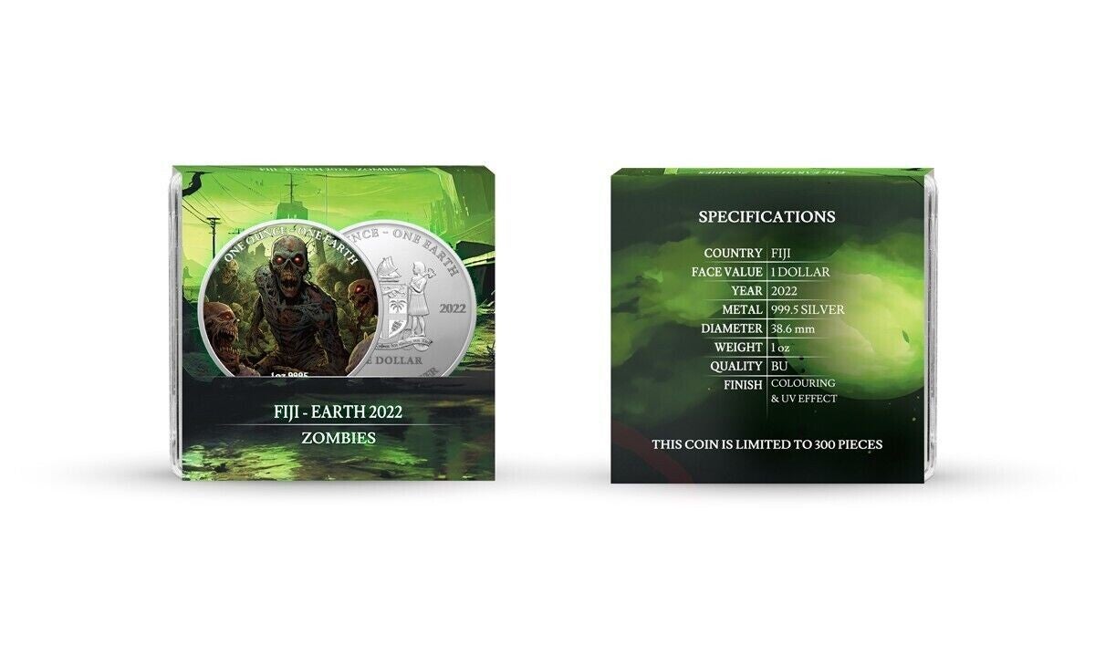 "Earth Zombies" 1 Oz Colorized Silver Coin Fiji 2022 green phosphorescen t