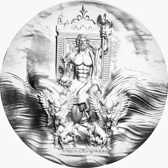 This impressive 2oz silver coin pays homage to the awe-inspiring Statue of Zeus at Olympia. The coin features beautiful high relief and is available in three variants. This version has a silver finish and comes in a case along with a certificate of authenticity. The mintage is limited to just 39 pieces worldwide.