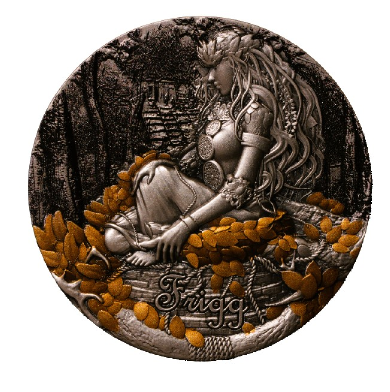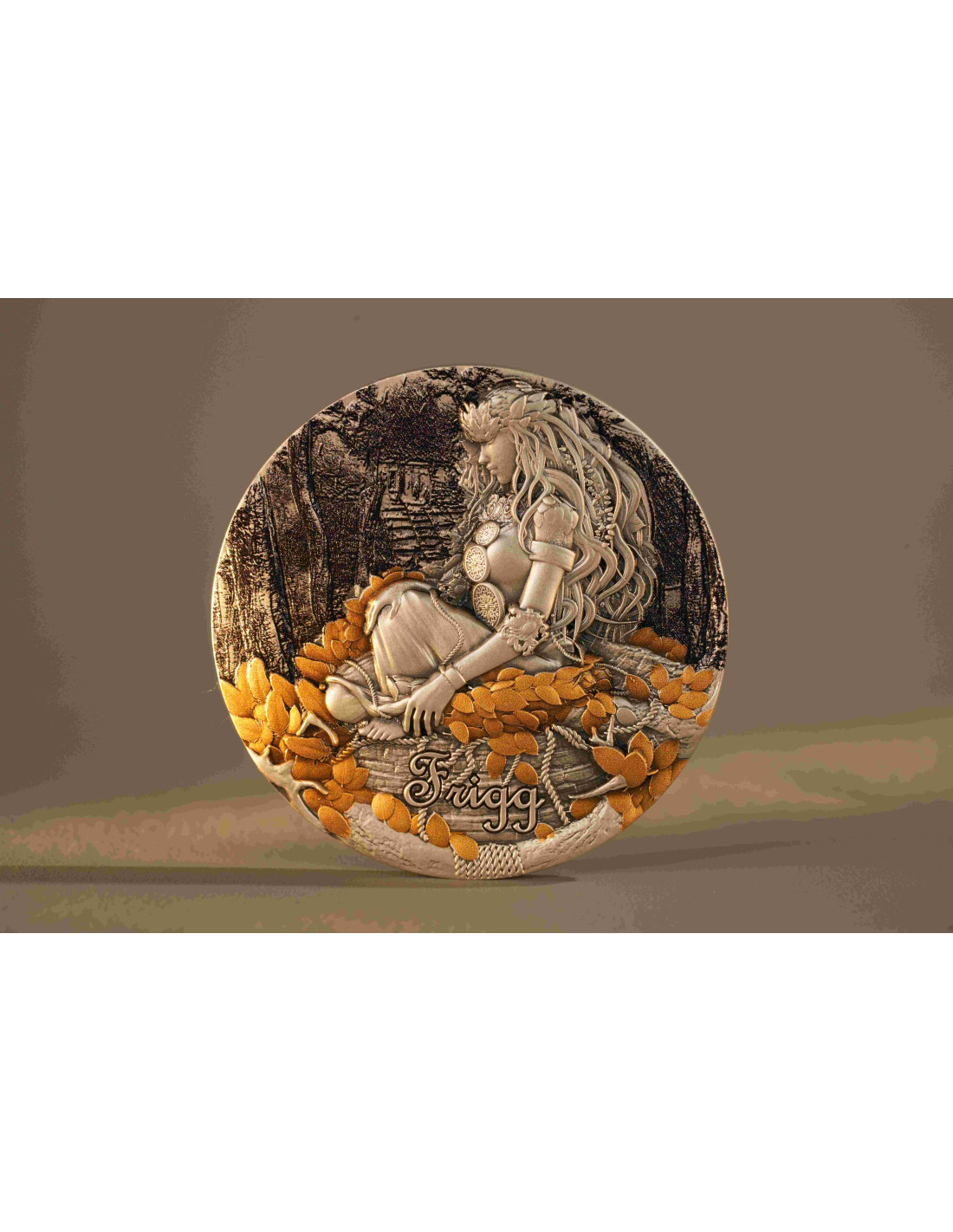 This 50 mm coin impresses with its elaborate design, which was refined using Smartminting technology and Alto Rilievo. It shows Frigg in a peaceful forest landscape. A special highlight is the selective gold plating, which creates a spectacular contrast. The front of the coin shows a detailed portrait of Frigg, surrounded by ornamental motifs.